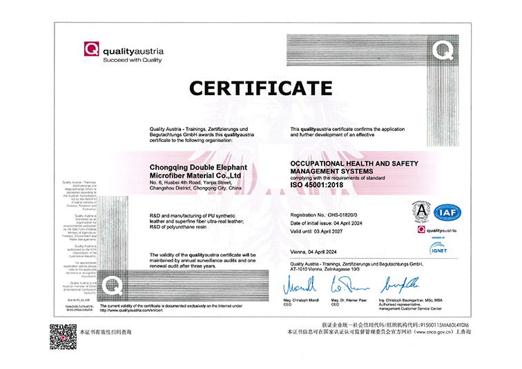 DE adheres to new development concept of innovation,coordination,green development,openness and sharing,takes high-quality development as the goal positioning,and strives to build a modern advanced manufacturing enterprise.DE is China's leading enterprise in artificial leather&synthetic leather manufacturing industry, Jiangsu Province high-tech enterprise,Jiangsu Province 100 key private science and technology enterprises,has undertaken and completed the "national 863 plan project","Jiangsu Province major scientific and technological achievements transformation project"and other national and provincial major scientific research projects,also has undertaken more than 30 national and industry standards drafting and revision work.It was awarded thetitle of"China Microfiber Synthetic Leather lnnovation Research and Development Base"by China Plastics Processing Industry Association. In 2019 DE has built the Double Elephant microfiber Chongging production base in accordance with the requirements of leading technology,intelligent manufacturing,advanced management and environmental friendliness,also this project was listed as amajor investment promotion project by the Chongqing Government,In April,2022,the"annual output of 30million meters of microfiber material phasel project"was put into operation,and was recognized as "Chongqing Digital Workshop"by Chongqing Economic and Information Technology Commission.In 2025microfiber materials phase ll projcet has been finished and start to produce. Double Eelphant Micro Fibre is forging ahead with the goal of being international advanced and leading in China"!Commited to become the leader of Chinese microfiber synthetic leather industry!