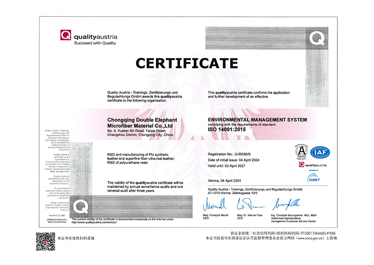 DE adheres to new development concept of innovation,coordination,green development,openness and sharing,takes high-quality development as the goal positioning,and strives to build a modern advanced manufacturing enterprise.DE is China's leading enterprise in artificial leather&synthetic leather manufacturing industry, Jiangsu Province high-tech enterprise,Jiangsu Province 100 key private science and technology enterprises,has undertaken and completed the "national 863 plan project","Jiangsu Province major scientific and technological achievements transformation project"and other national and provincial major scientific research projects,also has undertaken more than 30 national and industry standards drafting and revision work.It was awarded thetitle of"China Microfiber Synthetic Leather lnnovation Research and Development Base"by China Plastics Processing Industry Association. In 2019 DE has built the Double Elephant microfiber Chongging production base in accordance with the requirements of leading technology,intelligent manufacturing,advanced management and environmental friendliness,also this project was listed as amajor investment promotion project by the Chongqing Government,In April,2022,the"annual output of 30million meters of microfiber material phasel project"was put into operation,and was recognized as "Chongqing Digital Workshop"by Chongqing Economic and Information Technology Commission.In 2025microfiber materials phase ll projcet has been finished and start to produce. Double Eelphant Micro Fibre is forging ahead with the goal of being international advanced and leading in China"!Commited to become the leader of Chinese microfiber synthetic leather industry!